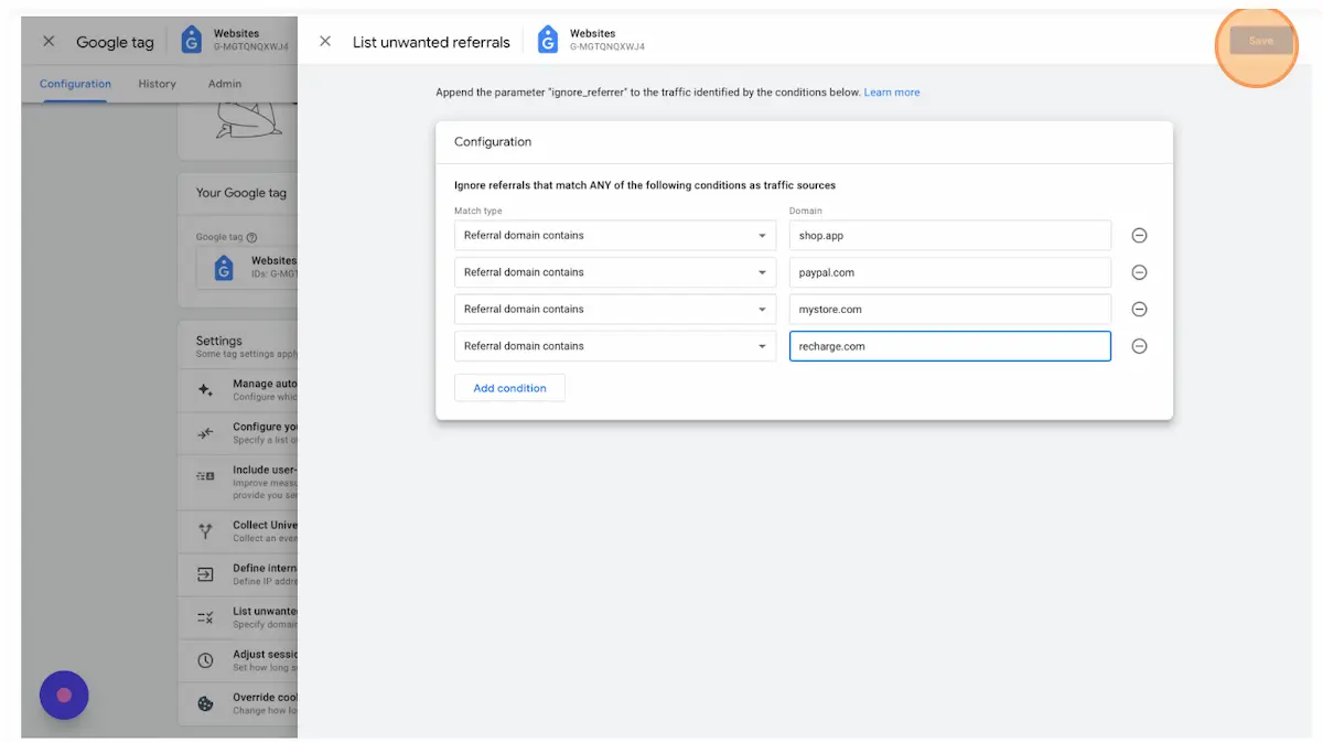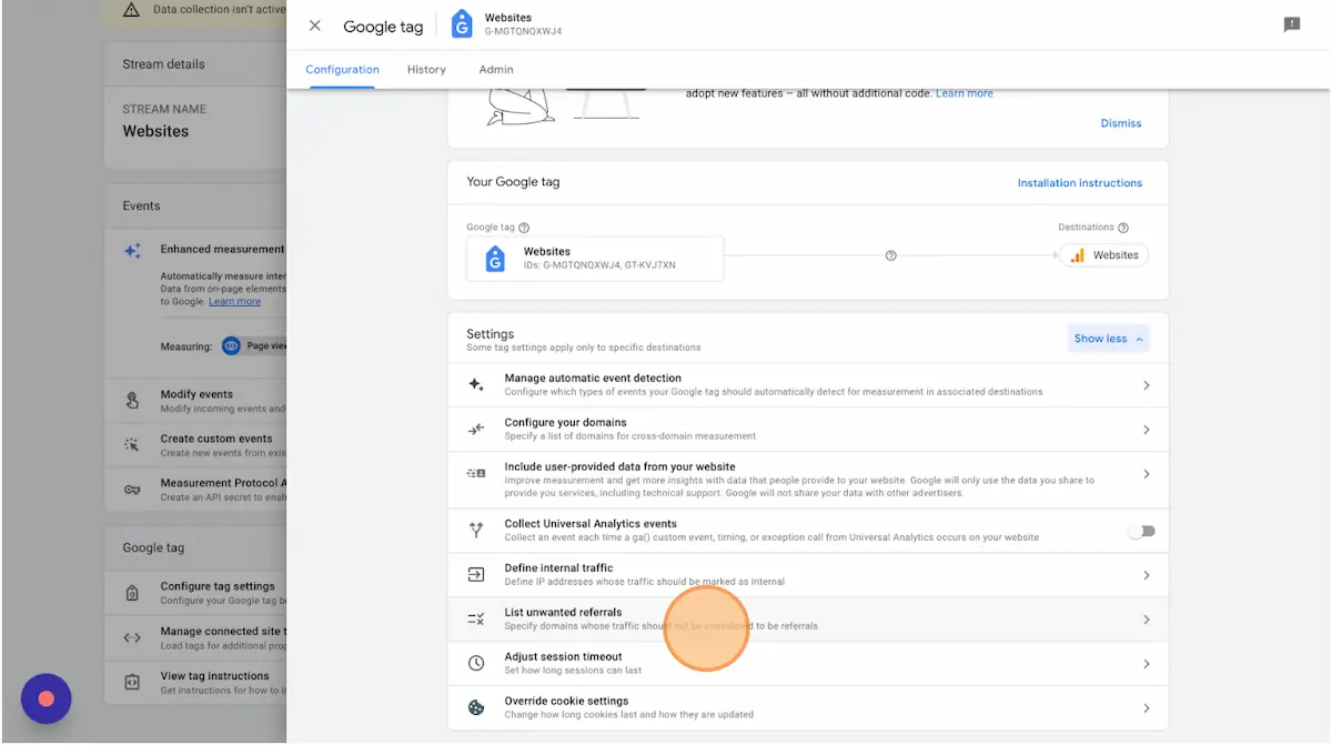 Return to your Websites Data Stream settings and select "List unwanted referrals".