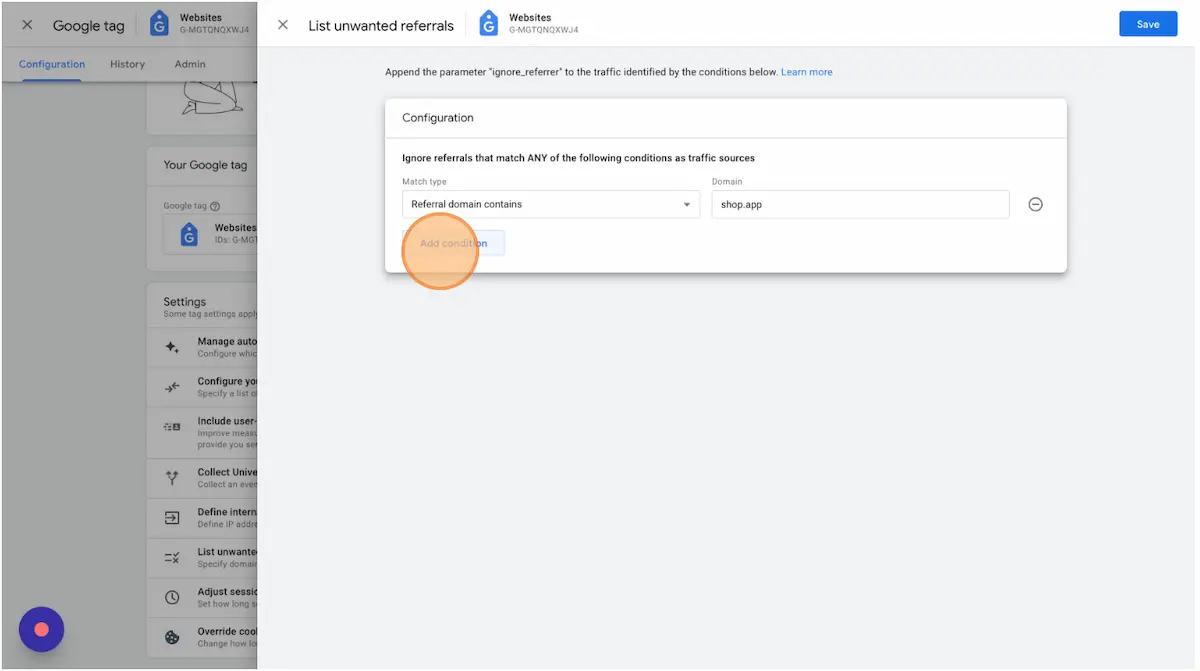 Return to your Websites Data Stream settings and select "List unwanted referrals".